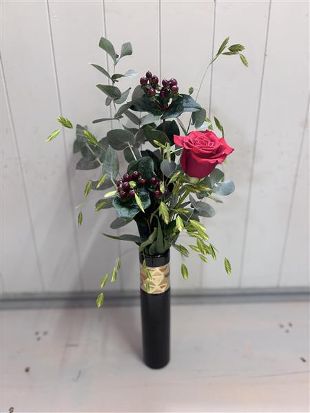 A timeless symbol of love and elegance. This single red rose is carefully selected by our team of expert florists. Presented in a bud vase with water it makes a striking statement and brings a touch of romance and beauty to any space.